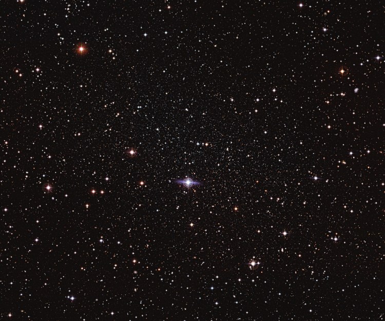 It’s one of the closest galaxies to Earth, but the Carina Dwarf Galaxy is so dim and diffuse that astronomers only discovered it in the 1970s. A companion galaxy of the Milky Way, this ball of stars shares features with both globular star clusters and much larger galaxies. Astronomers believe that dwarf spheroidal galaxies like the Carina Dwarf are very common in the Universe, but they are extremely difficult to observe. Their faintness and low star density mean that it is easy to simply see right through them. In this image, the Carina Dwarf appears as many faint stars scattered across most of the central part of the picture. It is hard to tell apart stars from the dwarf galaxy, foreground stars within the Milky Way and even faraway galaxies that poke through the gaps: the Carina Dwarf is a master of cosmic camouflage. The Carina Dwarf’s stars show an unusual spread of ages. They appear to have formed in a series of bursts, with quiet periods lasting several billion years in between them. It lies around 300 000 light-years from Earth, which places it further away than the Magellanic Clouds (the nearest galaxies to the Milky Way), but significantly closer to us than the Andromeda Galaxy, the closest spiral galaxy. So, despite being small for a galaxy, its proximity to Earth means that the Carina Dwarf appears quite large in the sky, just under half the size of the full Moon — albeit very much fainter. This makes it fit comfortably within the field of view of ESO’s Wide Field Imager, an instrument designed for making observations of large parts of the sky. Although this image in itself is not so striking, it is likely the best image of the Carina Dwarf Galaxy to date. The image was made using observations from the Wide Field Imager on the MPG/ESO 2.2-metre telescope at La Silla, and from the Victor M. Blanco 4-metre telescope at the Cerro Tololo Inter-American Observatory.